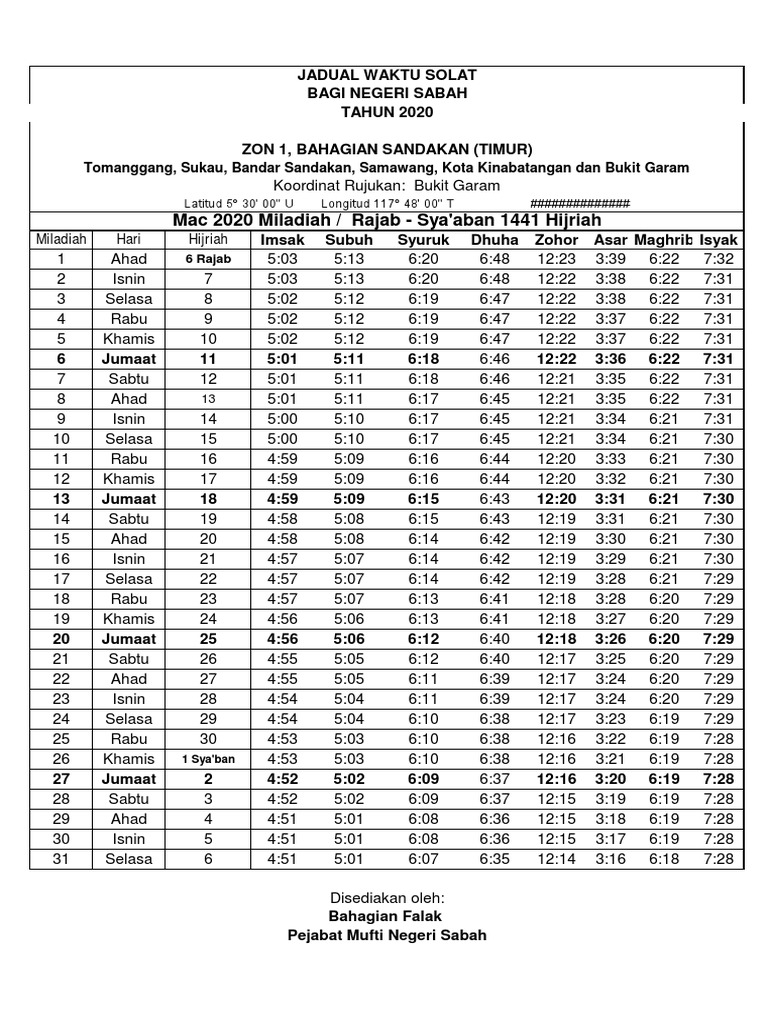Jadual Waktu Solat Terkini Bagi Seluruh Negeri Sabah Tahun